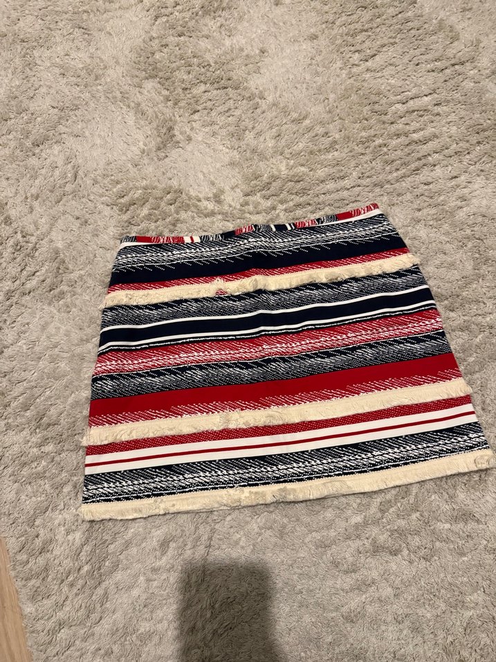 Bohem tarzda çok renkli batik desenli, kürk detaylı, tekstil kumaştan yapılmış, dış mekan için uygun oturan mini etek. Etiketli
