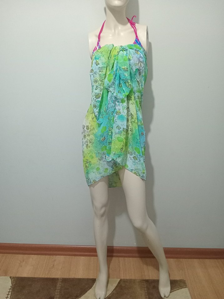 Kolsuz, bol kesim, pastel tonlarda tie-dye desenli bohem mini pareo. Plajda rahat kullanıma uygun, drapeli tasarıma sahiptir.