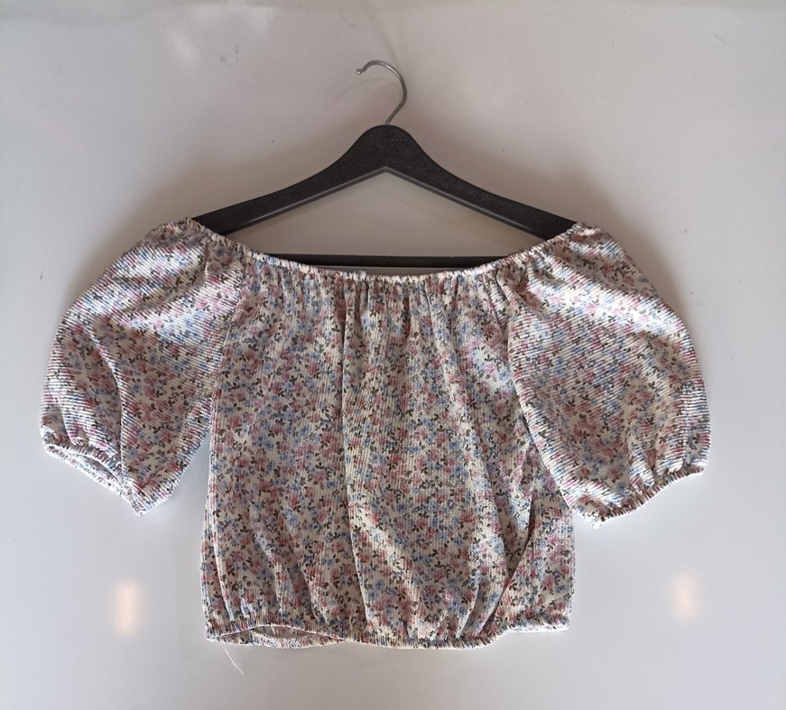 Bol kesim, kısa boyda, kısa kollu ve straplez yakalı bluz. Pastel tonlarda batik desenli, düğmeli ve yumuşak sentetik kumaştan yapılmıştır. Günlük kullanıma uygundur.