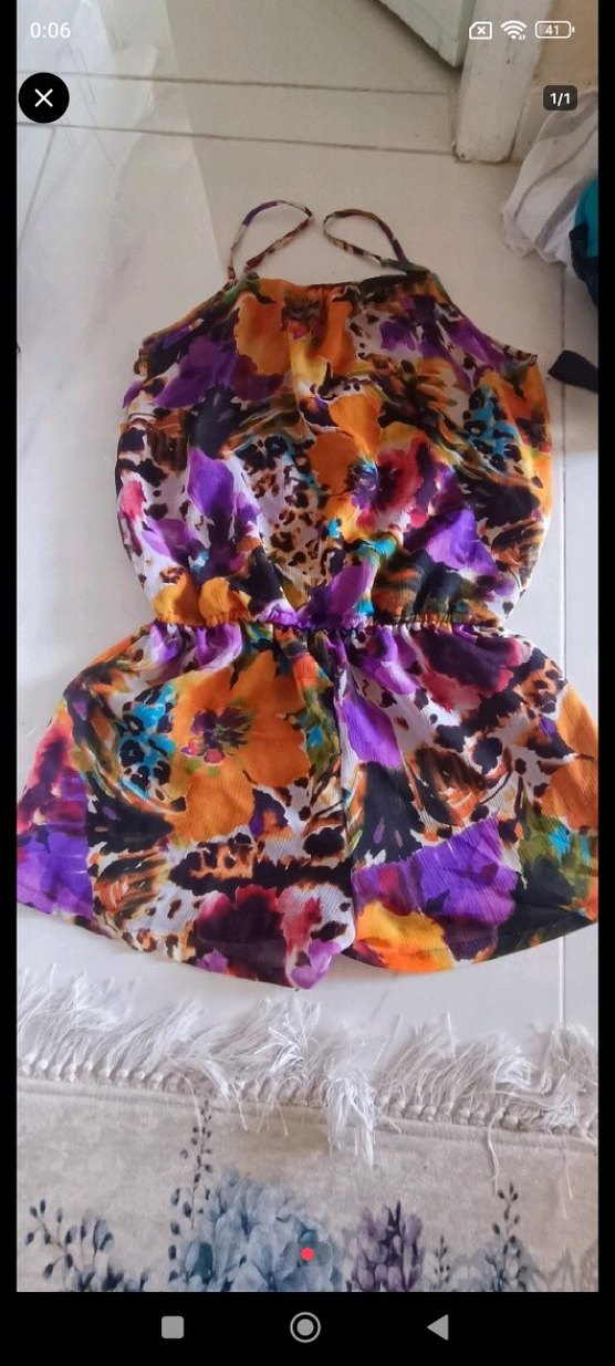 Sentetik kumaştan, bol kesim, askısız, drapeli, çok renkli tie-dye desenli mini tulum. Günlük kullanım için uygundur.
