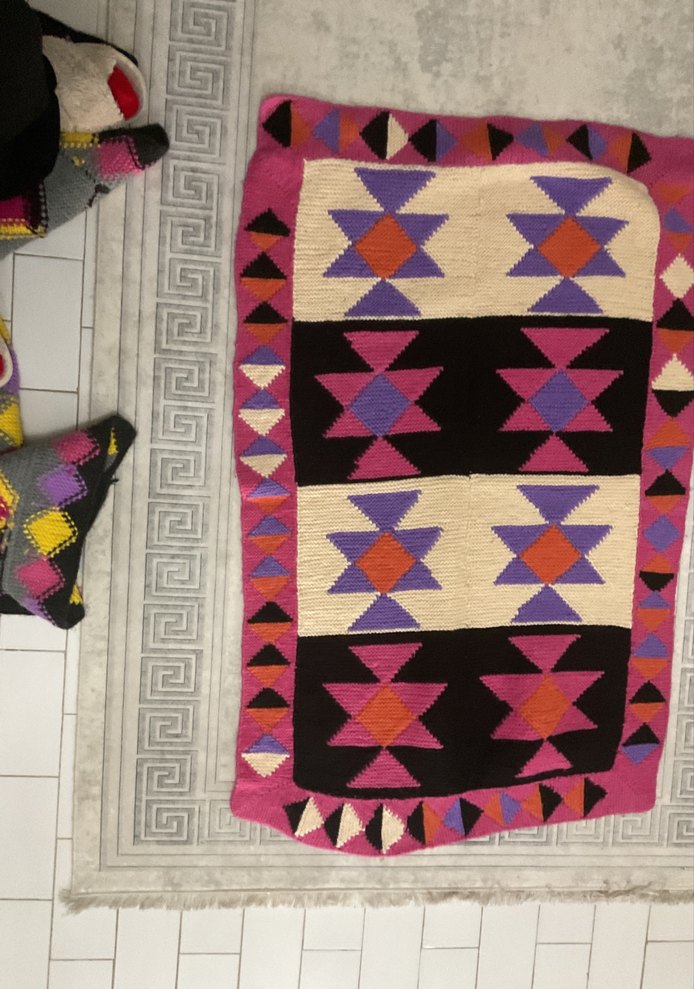 Koyu canlı renklerde geometrik nakışlı bohem tarzda çok renkli halı. Mekâna renkli ve sanatsal bir dokunuş katar.