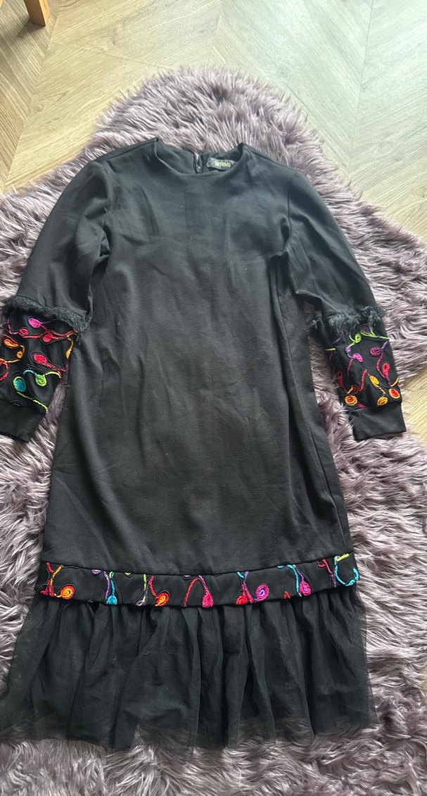 Bol kesim, uzun kollu bohem elbise. Kollar ve etek ucunda çok renkli nakış detayları ve kürk süslemeleri bulunur. Yuvarlak yaka tasarıma sahiptir.