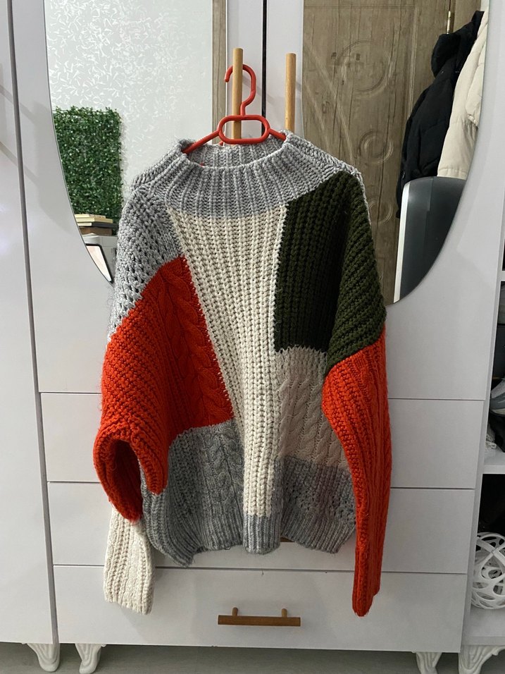 Bu kadın kazak, boğazlı ve uzun kollu, bol kesim örgü ve desenli tasarıma sahiptir. Çok renkli patchwork stiliyle rahat ve şık bir görünüm sunar. Midi boy örgü kumaştan yapılmıştır.