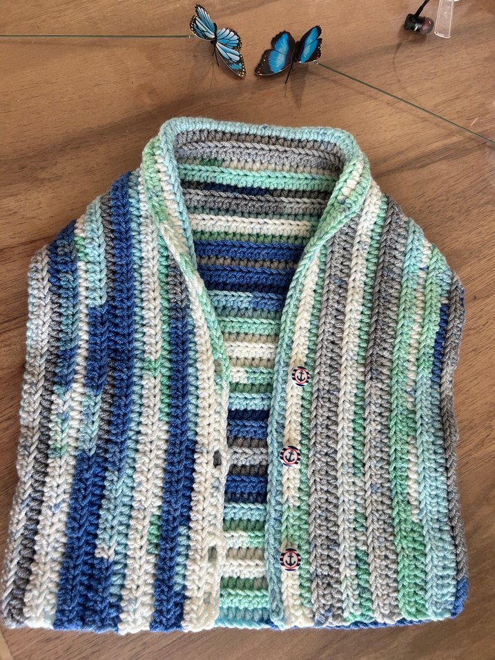 Bohem tarzda, çok renkli çizgili, yakalı ve kolsuz örgü yeni doğan erkek bebek yeleği… el emeğidir. Yeni doğandan 6 aya kadar bebek giyebilir.