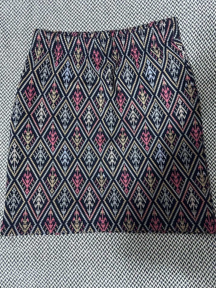 Bohem tarzı, çok renkli desenli örgü mini etek. Kısa boy ve normal kesim, günlük kullanıma uygun.