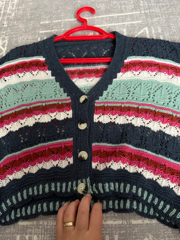 Bohem tarzı, çok renkli desenli örgü hırka. V yaka, uzun kollu, bol kesim ve midi boydur. Günlük kullanıma uygun, rahat ve şık bir parça.