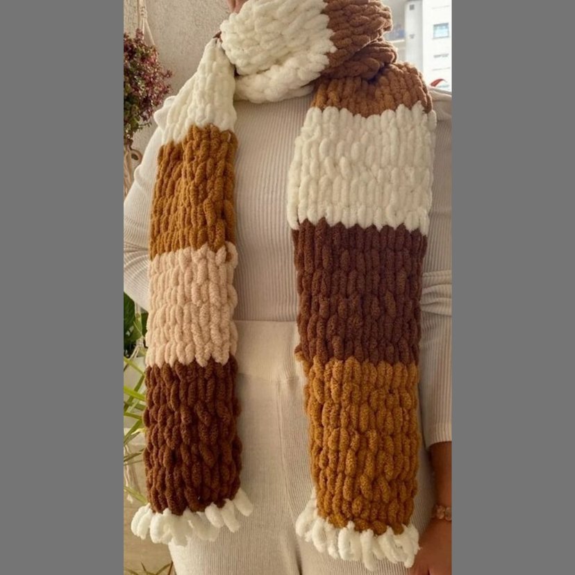 Kadınlar için örgü dokulu, açık kahverengi, krem ve bej tonlarında bohem tarzı atkı . Rahat ve sıcak bir dokunuş sunar. İstenilen renkte özel sipariş oluşturulur