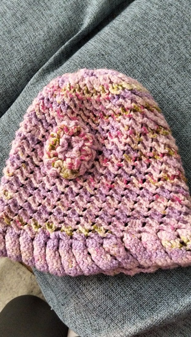 Kadın bere, pastel çok renkli örgü dokusu ve bohem tarzıyla rahat bir kullanım sunar. Üzerinde dekoratif çiçek detayı bulunur.