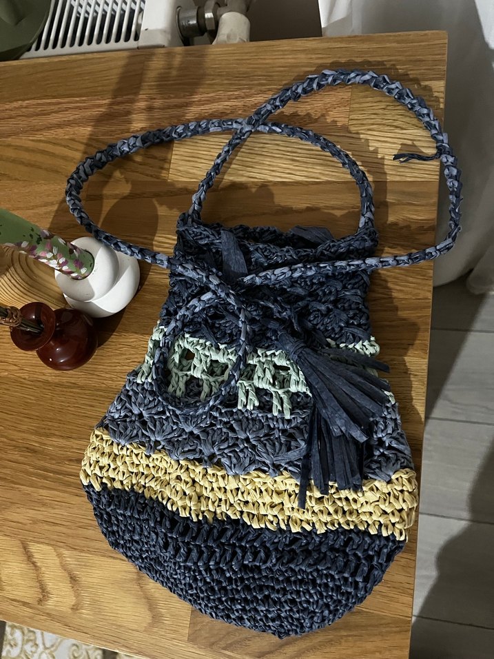 Bohem tarzda, gri ve çok renkli batik desenli örgü kadın çanta. Püsküllü ve örgülü askılı, günlük kullanıma uygun.