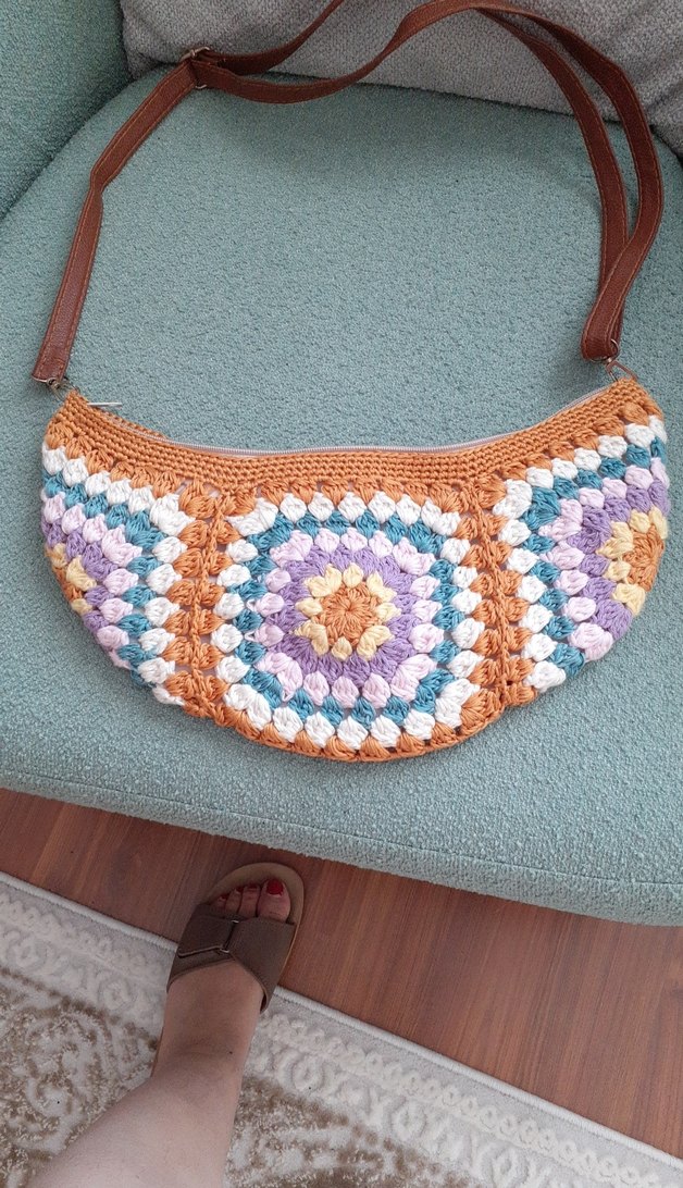 Bohem tarzda, çok renkli pastel tonlarda örgü desenli ve kahverengi deri askılı kadın çantasıdır. Günlük kullanıma uygundur.
