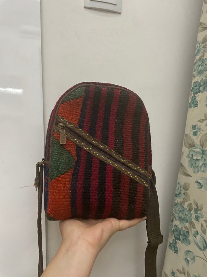 El yapımıdır. Bu kadın çapraz çanta, koyu çok renkli örgü ve batik desenle zipli kapanışa sahiptir. Bohem tarzı yansıtır, günlük kullanıma uygundur. Kartlar, ince cüzdanlar bozuk para ruj gibi şeyler ön tarafa rahatça sığdırılır