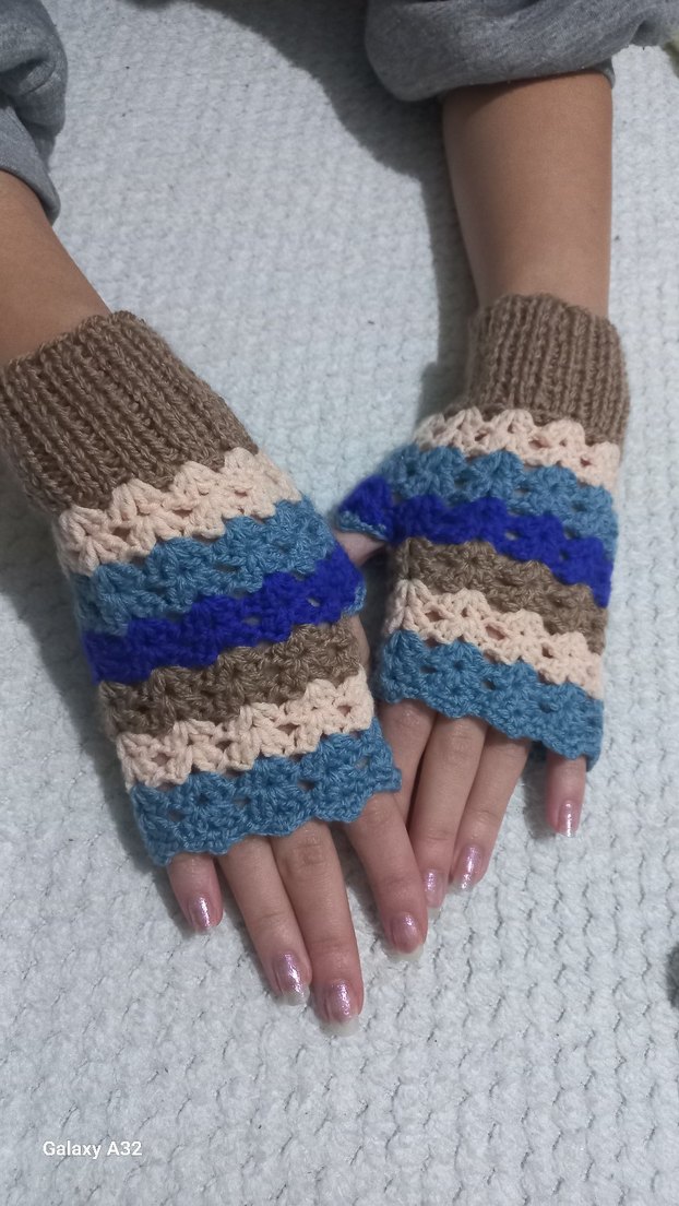 Yumuşak örgüden yapılmış, bohem tarzda çok renkli ve rahat örgü kadın eldiveni.