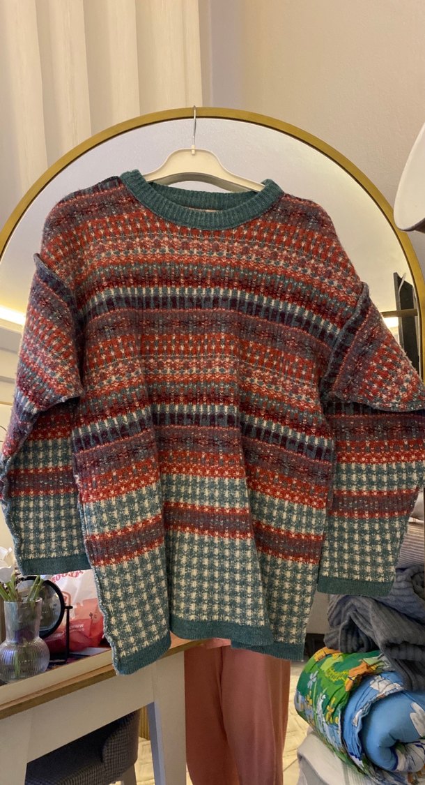 Bohem tarzda, çok renkli çizgili desene sahip, yumuşak örgü kumaştan yapılmış, yuvarlak yakalı, bol kesim uzun kollu kadın kazak. Günlük rahat kullanım için uygundur.