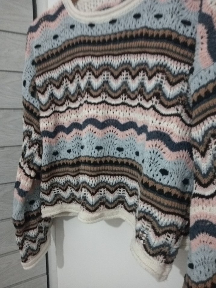 Bohem tarzda, çok renkli desenli, uzun kollu ve yuvarlak yakalı örgü kadın kazak. Rahat kesimi ve midi boyu ile günlük kullanıma uygundur. etiketi yoktur ama L bedene rahat olur lcvaiikiki alinmistir