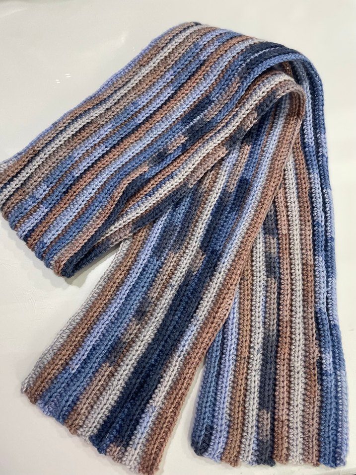 Bohem tarzda, çok renkli mavi gri tonlarında örgü kadın şal. Sıcak tutan, yumuşak dokulu, rahat kullanım sağlar.