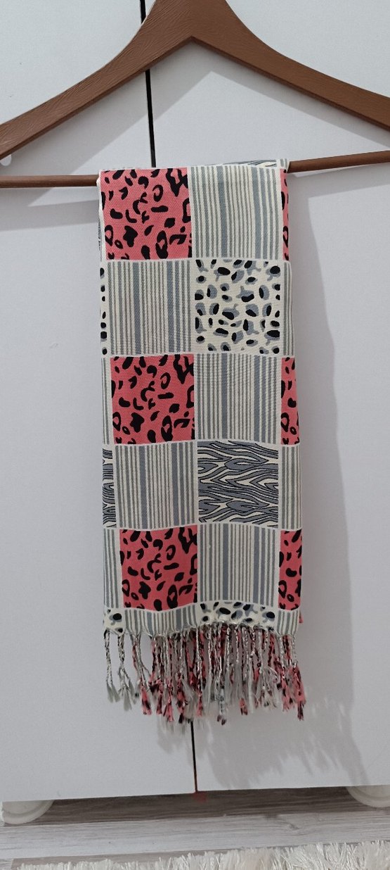 Kadınlar için örgü ve çok renkli desenlere sahip, gri tonlarında bohem tarzda rahat bir sal