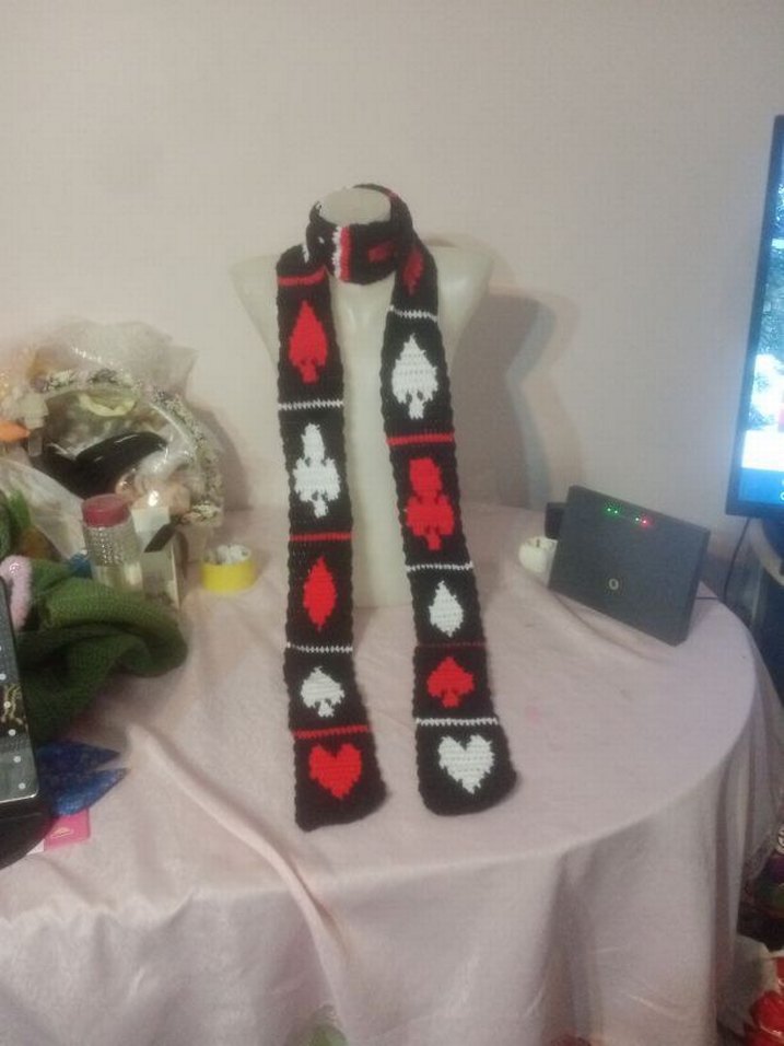 Gothic grunge punk rock emo y2k streetwear bohem hippi tarzlara uygundur. Siyah taban üzerine kırmızı beyaz renklerde iskambil deseni olan triko skinny scarf. Yeni örüldü.