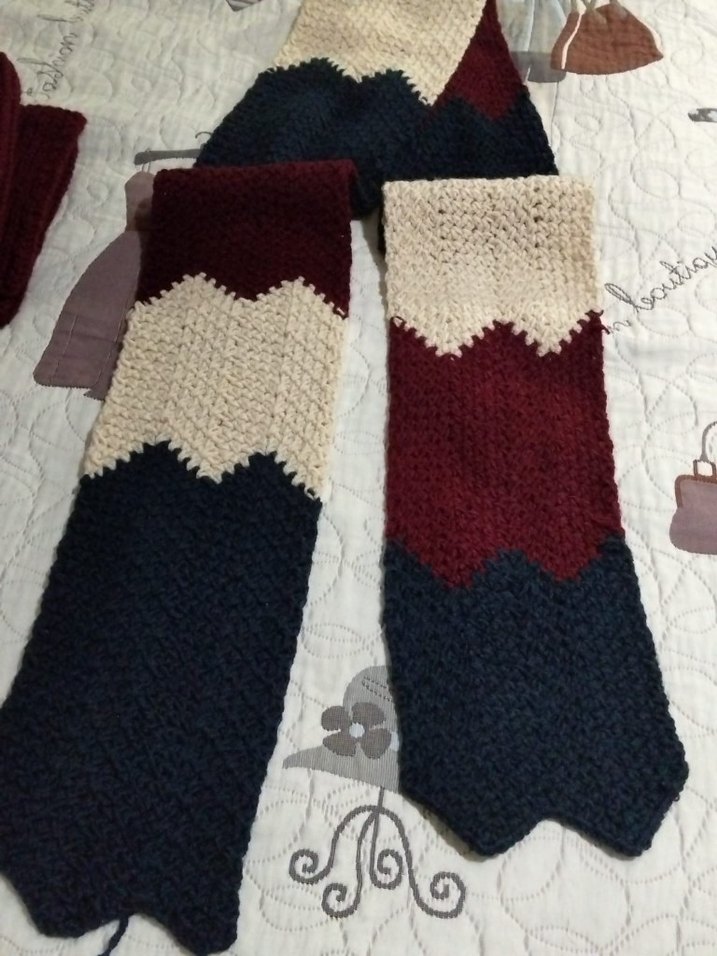 Bohem tarzı, koyu çok renkli iplikten örülmüş, bordo, krem ve lacivert tonlarını içeren örgü kadın şal. El Yapımı Atkı 2 metreden uzun yün içerikli iple orulmustur
