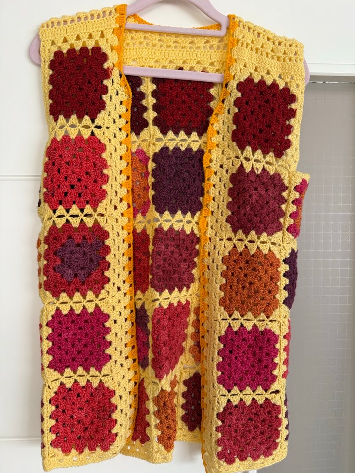 Örgü, kolsuz ve gevşek kesimli kadın yeleği. Çok renkli bohem desenlerle midi boyda, günlük kullanıma uygun.