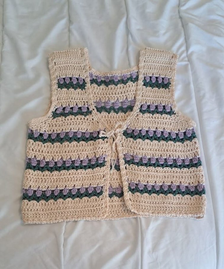 Bohem tarzda, askısız yaka ve bağcıklı önden, pastel çok renkli, örgü kumaştan, kolsuz ve bol kesim kız yeleği. el emeğimdir istek üzerine örülcektir farklı renklerde yapılır
