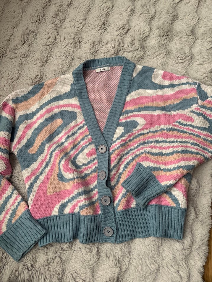 Örgü, bol kesim, uzun kollu ve V yakalı bu hırka, pastel tie-dye desenleriyle bohem tarzı yansıtıyor. Günlük kullanıma uygun rahat bir parça.