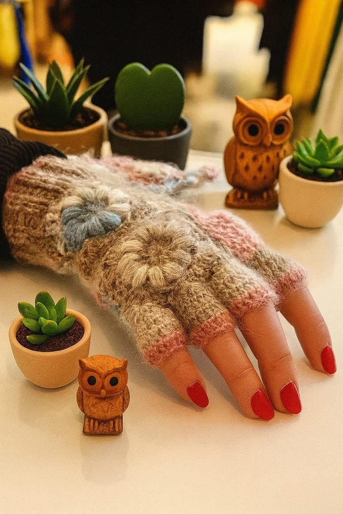Bohem tarzda, pastel çok renkli örgü kadın parmaksız eldiven. Çiçek desenli, rahat ve retro-hippi havasında.