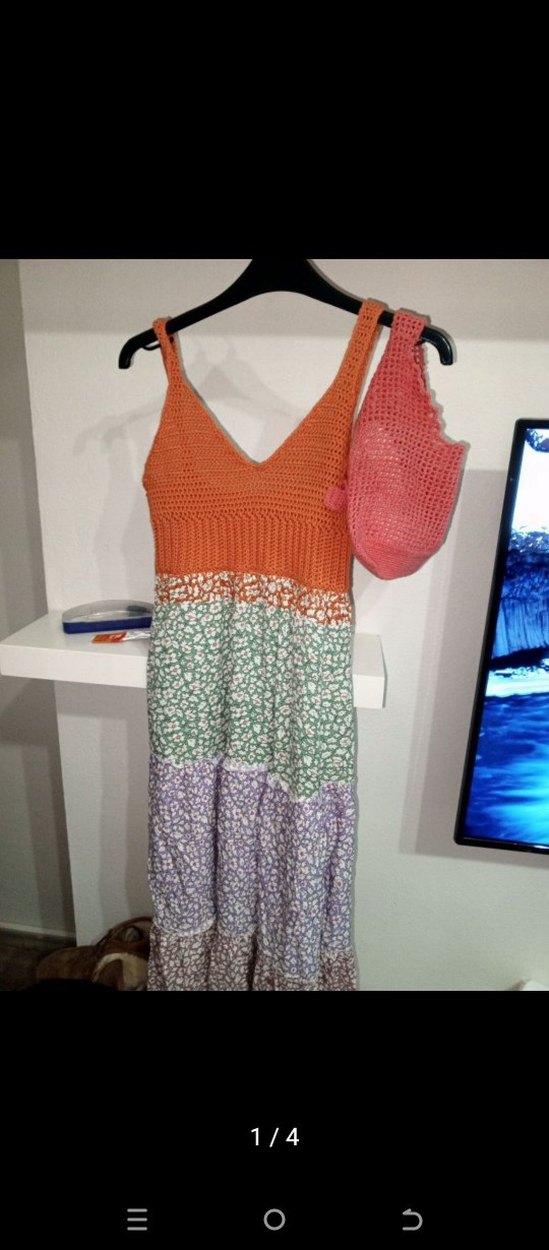 Kolsuz, bohem tarzda, straplez yakalı ve bol kesim çok renkli örgü uzun elbise, günlük kullanım için uygundur.