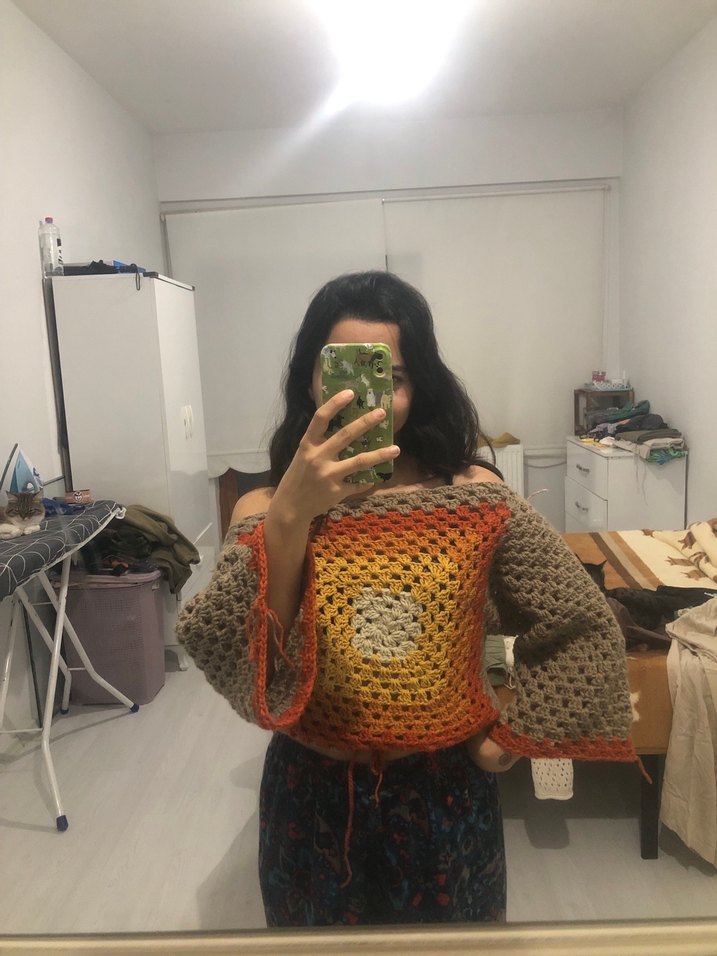 El örgüsüdür kendim ördüm . Madonna yaka . Kolları biraz geniş iniyor. Arkası da aynı şekilde renkli . Boyum 155 kilom 48 bende duruşu bu şekilde xs-s bedenlere uygun .
