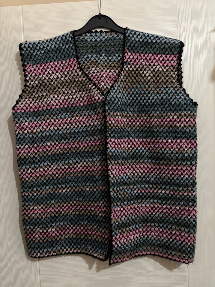 Çok renkli, el örmesi, büyük beden, rahat, kadın yeleği. Omuz boyu 52cm, koltuk altı/göğüs 59cm ve boyu 70cm. 44-48 bedene uyumludur. Bohem tarzı, çok renkli, gri ve pembe tonlarında örülmüş, V yaka, kolsuz, bol kesim kadın yeleği. Rahat ve günlük kullanıma uygun.