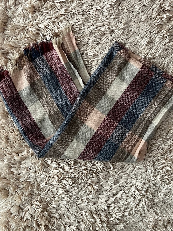 Yumuşak yünden örülmüş, gri, mavi ve bordo tonlarında çok renkli çizgili kadın şalı. Bohem ve retro tarzı yansıtır.