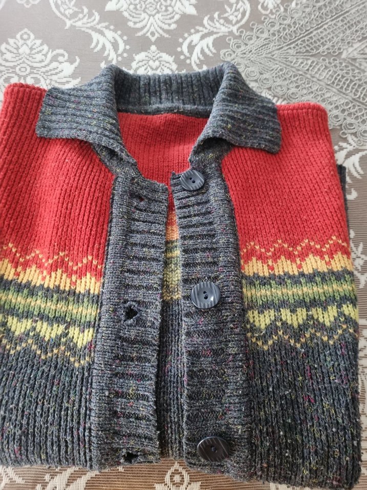 Bohem tarzı çok renkli, örme kolsuz hırka. Gömlek yaka, bol kesim ve midi boyda, günlük kullanıma uygun.