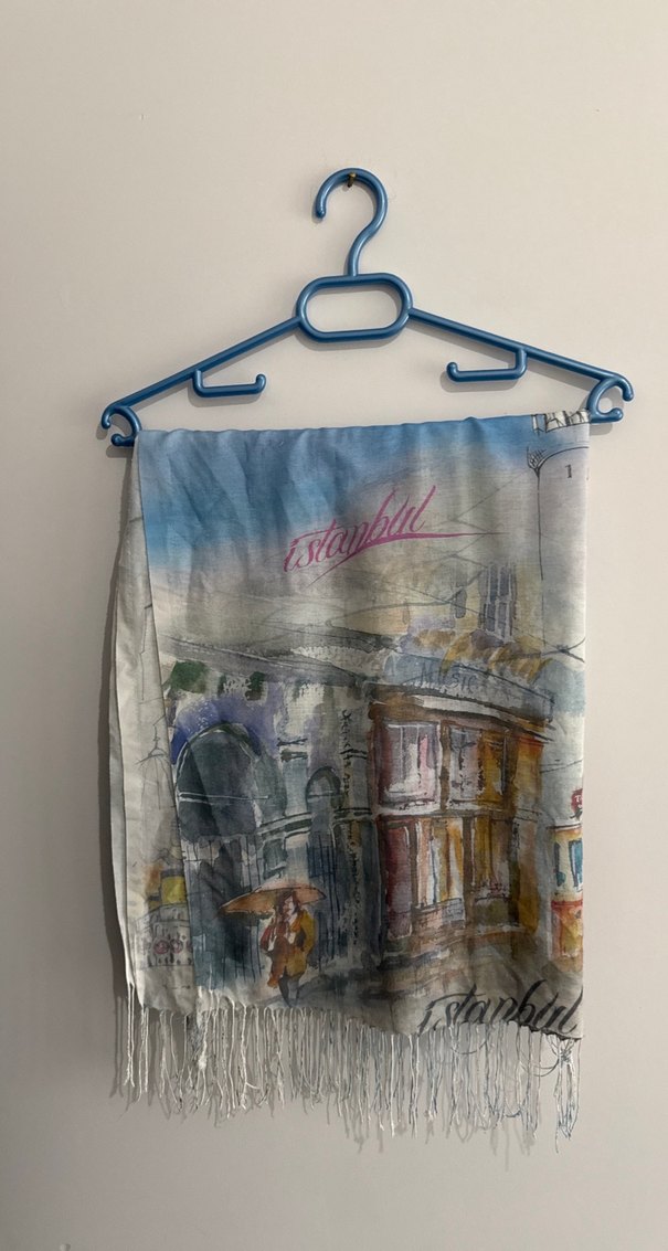 Bohem tarzda çok renkli pastel tonlarda, İstanbul temalı baskılı, drapeli kadın şalı.