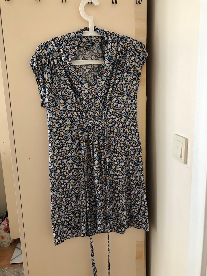 Bohem tarzda, çok renkli desenli, V yakalı, salaş kesim, drapeli, kolsuz midi elbise. Rahat ve günlük kullanım için uygundur. 75 cm boyu var. Belden oturtmalı ve kuşağı var