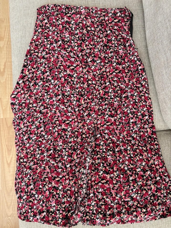 Bohem tarzda, çok renkli bağlama desenli, pileli ve bol kesim midi etek. Sentetik kumaştan, rahat ve dış mekan kullanımı için uygun. Yandan fermuarlıdır. Çok az kullanılmıştır.