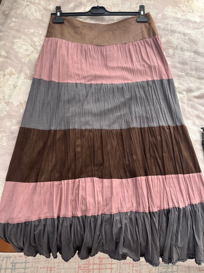 Bohem tarzda, çok renkli, pileli, uzun ve bol kesim bir tekstil etek.