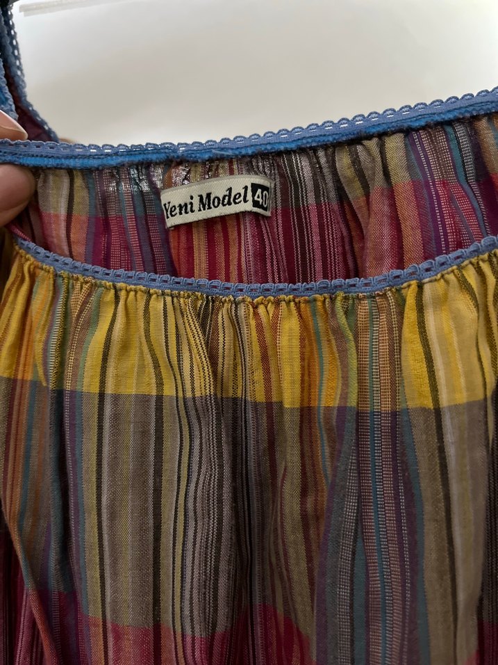 Bohem tarzda, çok renkli tie-dye desenli, pilili ve bol kesim elbise . , yumuşak tekstil kumaştan yapılmıştır. "YeniModel40" etiketi bulunur.