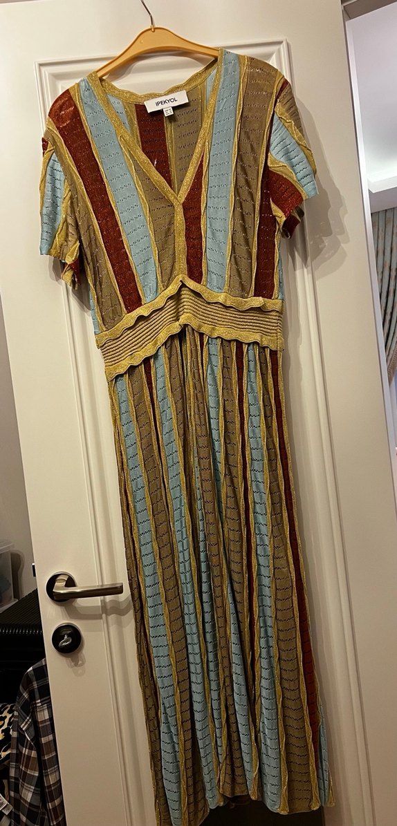 Bohem tarzda, pilili ve bol kesim çok renkli uzun elbise. Koyu renkli çizgili desen, askılı kollar ve V yakaya sahiptir.