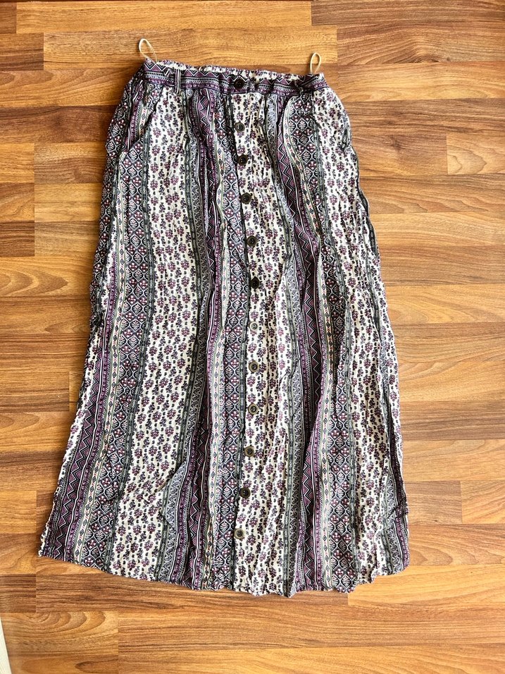 Bohem tarzı çok renkli pilili uzun etek, bol kesim ve gri tonlarda desenli kumaş ile günlük kullanıma uygun. Cepli az kullanılmış astarlı etek