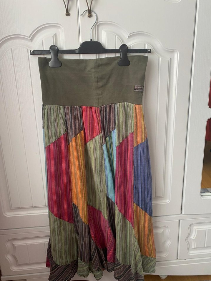 Bohem tarzı, pilili detaylı, bol kesim ve koyu çok renkli batik desenli uzun tekstil etek.