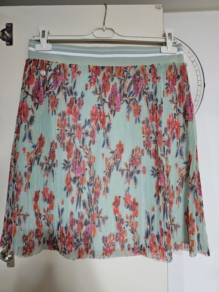 Yumuşak sentetik kumaştan, pastel çiçek desenli bohem piliseli mini etek. Bol kesim ve lastikli bel bandına sahiptir, açık hava kullanımı için uygundur.