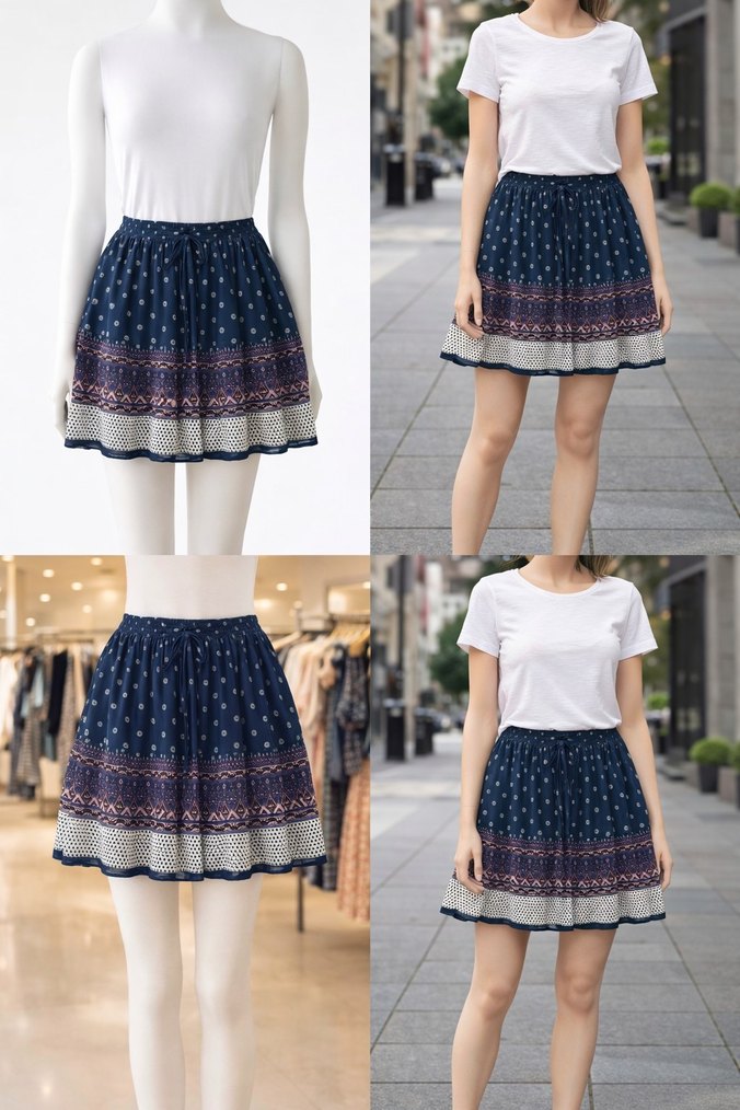 Bohem tarzda, piliseli detaylı, çok renkli batik desenli, sentetik kumaştan yapılmış bol kesim mini etek. Günlük kullanım için uygundur.