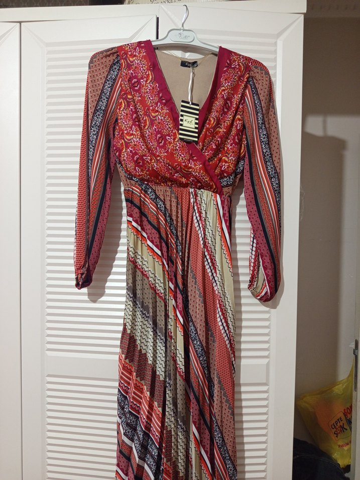 Bohem tarzı, piliseli etekli, V yakalı uzun elbise. Salaş kesim ve askılı kollarıyla çok renkli açık tonlarda tie-dye desenlidir. Sentetik kumaştan, günlük kullanıma uygun.