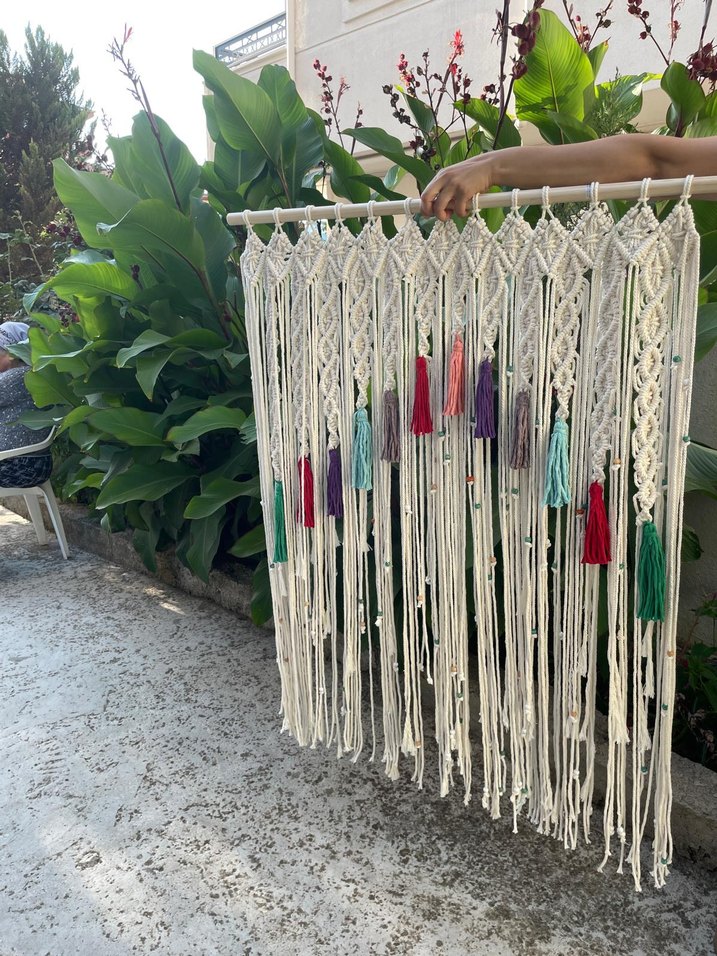 Bohem tarzda, çok renkli püsküllere sahip makrome duvar süsü. Hafif renkli bükümlü kumaştan yapılmış, mekana doğal ve sanatsal bir dokunuş katıyor.