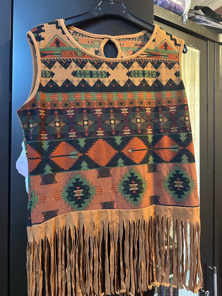 Kolsuz, çok renkli bohem yelek, yuvarlak yaka ve bol kesime sahiptir. Kısa boyda ve etek kısmında püsküller bulunur, günlük kullanım için uygundur.