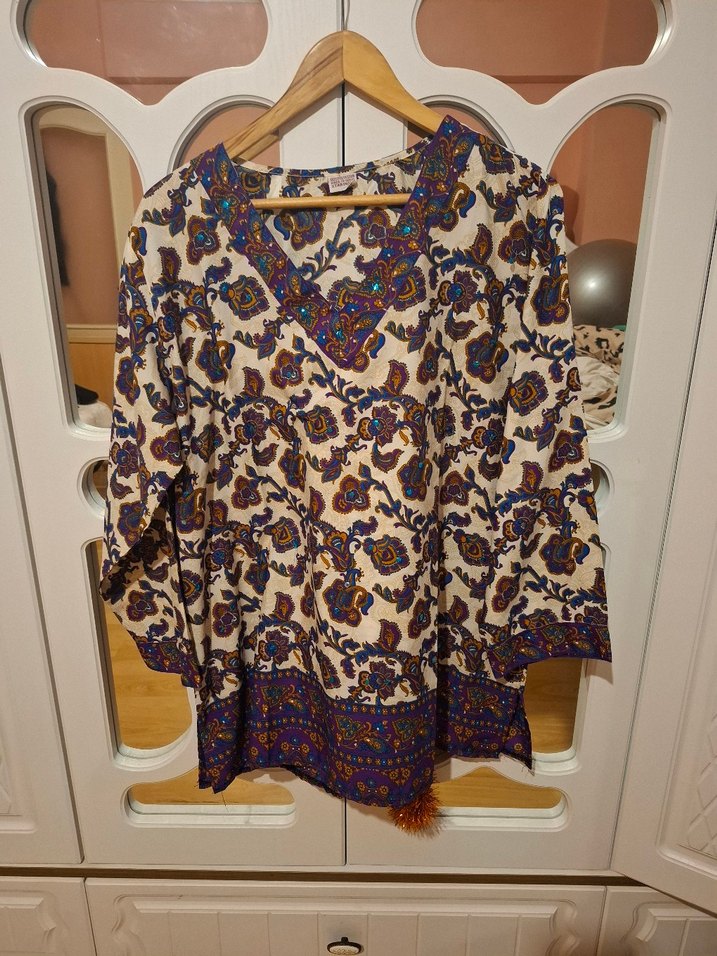Bol kesim, uzun kollu bohem tunik, V yakalı ve püsküllü detaylı. Çok renkli, açık tonlarda batik desenli ve midi boyda, yumuşak kumaştan. Günlük kullanım için uygun.