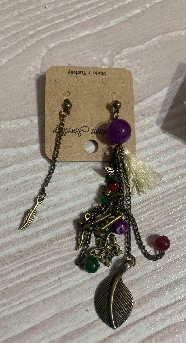 Bohem tarzı çok renkli boncuklar, püsküller ve etnik desenlerle süslenmiş uzun küpeler. Günlük kullanıma uygun.
