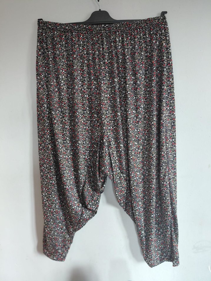 Gri ve çok renkli, salaş kesim, drapeli ve batik desenli kadın . Yumuşak sentetik kumaştan, açık hava için uygun. menekşe kumaş şalvar