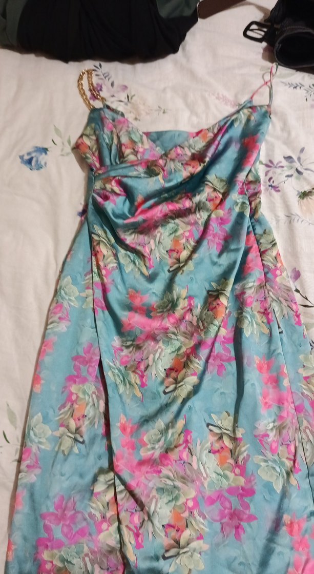 Bohem tarzda, saten dokulu, çok renkli çiçek desenli, drapeli kadın sarma elbise.