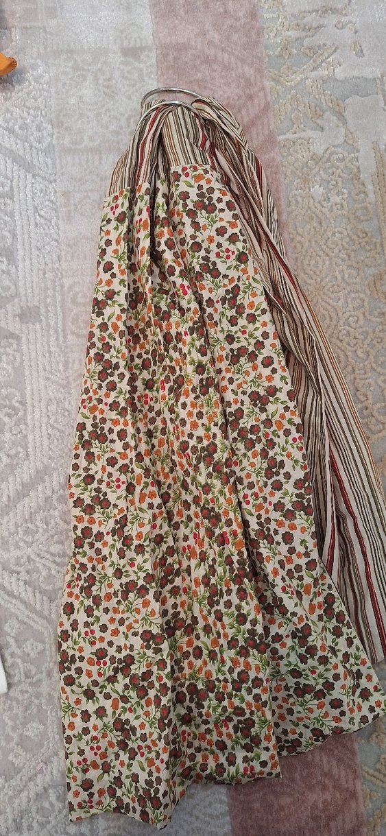 Çiçek desenli çok renkli ve gri çizgili dokuma kumaştan, bohem tarzda sling,hic kullanilmadi.