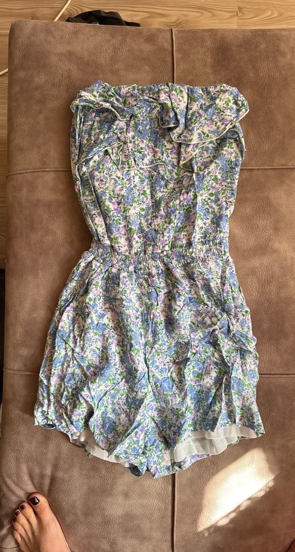 Rahat kesim, straplez, volan detaylı, astarlı mini tulum. Pastel tonlarda çiçek desenli, yumuşak pamuklu kumaştan, zamansız tasarım.